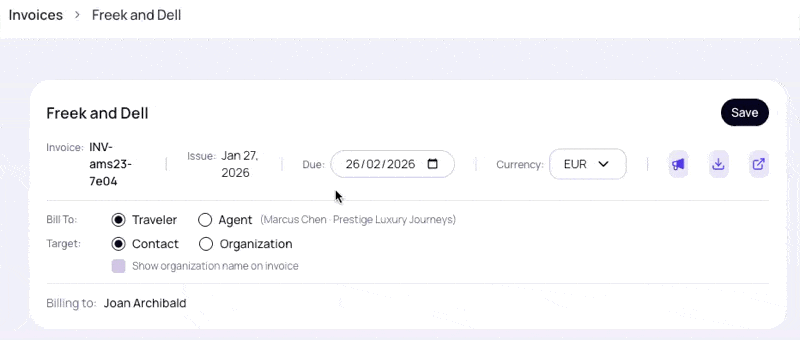- Show/Hide Organization on Invoices: When a billing contact is linked to an organization, you can now toggle whether the organization name appears on the invoice. Use the new switch in the invoice editor to control this display for both the PDF export and the public invoice view.